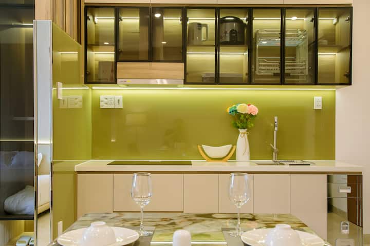Fully furnished, high-end, modern, prestigious equipment to stay long term and work.The spaceThe apartment is on the 2nd floor, with a tree-planted balcony overlooking Hoang Ke Vien street and the city.The apartment has a very convenient location: located only 780 meters from the sea. From the apartment go to famous landmarks: My Khe Beach 1.1 km; Dragon Bridge 2.1 km; Museum of Cham Sculpture 2.4 km; Danang Cathedral: 2.8 km; Han River Bridge 2.9 km.Pharmacy: 5.0 m; Spa salons and cafes, restaurants: within 50 m. From the apartment go to the Gym: 170 m; 210 m supermarkets; An Thuong Night Market: 510 m, Bac My An market 710 m, 4.5 km from Da Nang International Airport.Guest accessFully furnished apartment for working and long term stay…with high quality furniture, modern equipment, with famous and prestigious brands.The apartment has an area of nearly 49m2 with a separated toilet room and bathroom. In the apartment there is a washing room, equipped with a separate washing machine, with a rack to dry clothes in. A two-seat kitchen and a kitchen cabinet equipped with a set of pots, pans, cups, forks, knives, spoons, forks, tea glasses, wine glasses and also a wine opener. For cooking, the apartment is equipped with a large Panasonic 268-liter refrigerator, knives, cutting boards, chopsticks; rice cooker and kettle; Microwave with grill function; 4-seat large dining table. About working facilities: The apartment has 1 working table, 1-2 office chairs, 1 65 inch sony smart TV. Air-conditioned 2.0 HP. The private bathroom is equipped with 1 hair dryer, all kinds of towels and 2 bath robes and is changed weekly. King bed 2.0 m * 1.8 m wide, premium mattress, white comforter, pillows and changed weekly. Independent toilet room with bathroom with modern and full equipment. Other equipment: the apartment has slippers, clothes hangers, a cool fan, a rain umbrella, a clothes iron, soap shelves, a 20-liter water bottle shelf,…Other things to note1. Complimentary:- High speed wifi > 95 – 200 Mbps;- Coffee, tea, drinking water, candy if used in the reception area;- Weekly room cleaning;- Replace blankets, pillows and pillows weekly;- Fresh change of bathrobes, towels; face towels, hand towels weekly;- Toilet rolls in the toilet;- Domestic water (shower, wash, wash..)- Tissue paper in the box (on the dining table)- Motorbike parking in the basement;- Contact to book, rent motorbikes, cars;- Food service consultancy, entertainment…- Contact the tour…- Pick up, food,…- Luggage storage,2. Charge – Living electricity in the apartment: there is an electronic meter mounted in front of the apartment door to measure the amount of electricity in the apartment consumed since you received the apartment and until the handover of the apartment. Electricity price 3,800 VND/kw