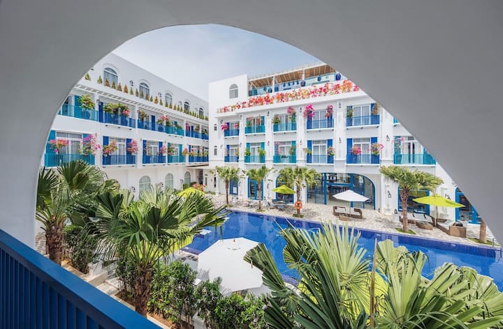 Step into a Mediterranean-inspired escape in the heart of Vietnam! This dreamy Santorini-style suite features calming white & blue décor, a cozy queen bed, and a charming Juliet balcony overlooking the sparkling pool. Just a 5-minute stroll to the soft sands of My Khe Beach, this stylish retreat is perfect for relaxation & romance. Unwind, soak up the vibes, and make unforgettable memories! A complimentary buffet breakfast is included to start your day with Relax.