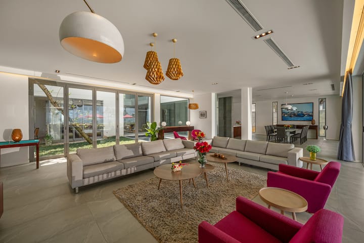 Wake up to panoramic ocean views in this 6BR beachfront villa with a private pool and direct beach access. Designed for space and comfort, it features open-plan living, elegant interiors, and seamless indoor-outdoor flow. Perfect for families or groups seeking privacy and luxury, with Da Nang and UNESCO-listed Hoi An minutes away. Your own private coastal retreat.The spaceThis villa offers 6 spacious bedrooms, each with en-suite bathrooms, and open living spaces that flow seamlessly to the outdoors. A modern kitchen, expansive dining areas, and floor-to-ceiling glass create a light-filled retreat. The private pool and direct beach access make it perfect for families or groups seeking luxury and privacy by the ocean.Guest accessGuests have exclusive access to the entire villa, including all 6 bedrooms, private pool, beachfront garden, kitchen, dining areas, and living spaces. The villa is fully private and not shared with other guests.Other things to noteHousekeeping is provided daily. Airport transfers, in-villa dining, and excursions can be arranged upon request. Please note, the villa is part of a private resort with 24/7 security and private beach access. Events or parties must be pre-approved to maintain community standards.