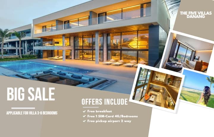 Villas is a great choice for relaxation. Nice location by the sea, convenient transportation, located in the middle of the road to Hoi An from Da Nang. Right next to the leading entertainment complex in Vietnam – Cocobay and Mongomelink golf. Resort have 34 Villas with Modern design, class and luxury 5 star standard is: 4-season swimming pool, Restaurant, Convention Center, Gym, Sauna, Spa, Bar …The spaceVilla is Beach Font, for 12 adults & 6 children; 6 bedrooms with King-size bed, 6 bathrooms, a living room, a kitchen and a private pool.Guest accessDining room table for eight guestsIn-villa wine fridgeFull amenities: tea and coffee-making facilities, personal safe and hairdryerIDD telephone, minibar and satellite TV channelsDigital newspaper and magazine serviceUnlimited WiFiDVD player (movies on request)Other things to noteMy Reviews:- Useful information in Da Nang- Tennis court, Spa 100m away from Villa- Golf course is 1km from Villa- Free pick up at Danang airport (free for booking at least 3 nights) – use of private pool and free public swimming pool- Security 24/7- standard 5 *- Free electric vehicles- Top 20 beaches in the world- Everyone is friendly- Good climate- Free 2 bottles of water per room per day